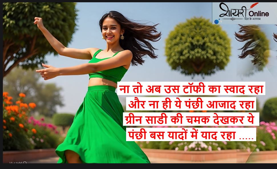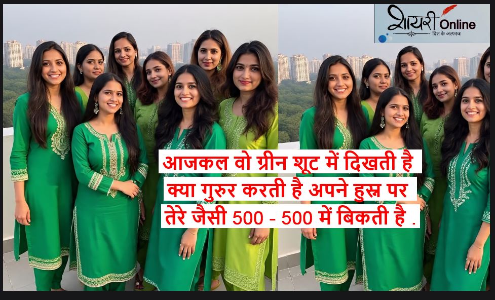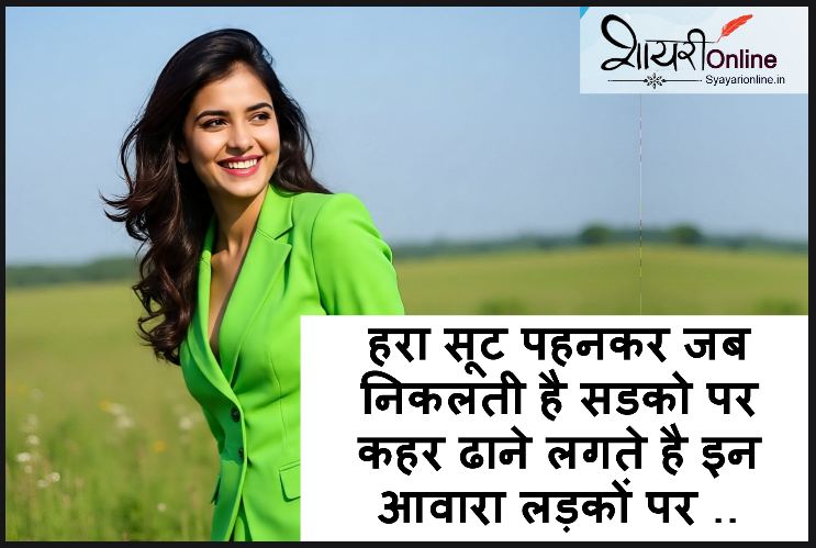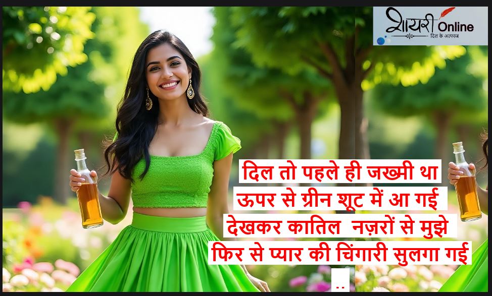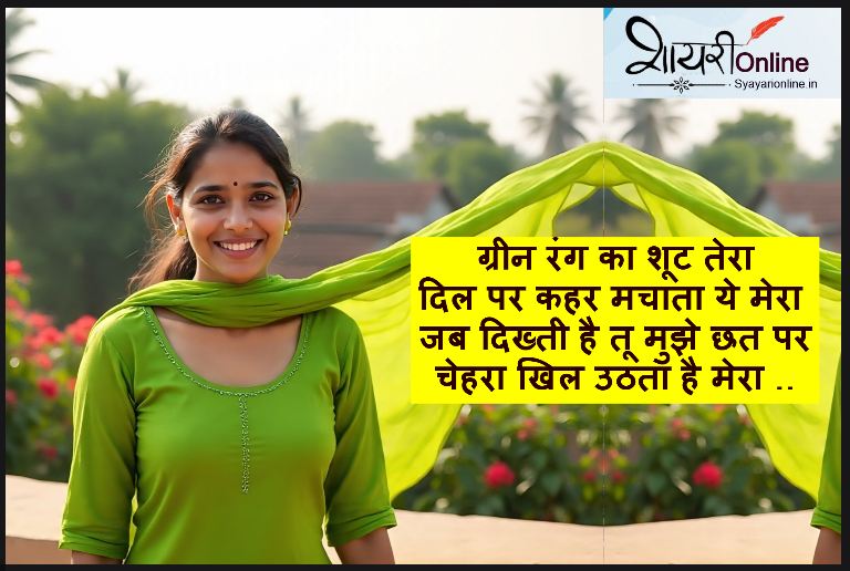 green suit shayari in hindi ग्रीन सूट पर शायरी , हमे पता है की लड़कियो को ज़्यादातर पिंक कलर पसंद है , पिंक के बाद दूसरा नंबर हरे रंग का आता है। हरे रंग के अंदर लड़की बहुत ज्यादा आकर्षक लगती है । हरा रंग मन को शांत करता है। अगर हम हरे रंग के सूट की तारीफ के मधायम से करना चाहे तो हमारे पास अलफाज नहीं मिलते है। इसलिए हम आपके लिए हरे रंग के सूट पर 150 शयरियों का संग्रह लेकर आए है। अगर आपका मन कर रहा है की में भी अपनी प्रेमिका की तारीफ शायरी के माध्यम से करें , तो आप हमारी पोस्ट को पढ़िये , आशा करते है की आपको अपनी मनपसंद शायरी मिल जाएगी।